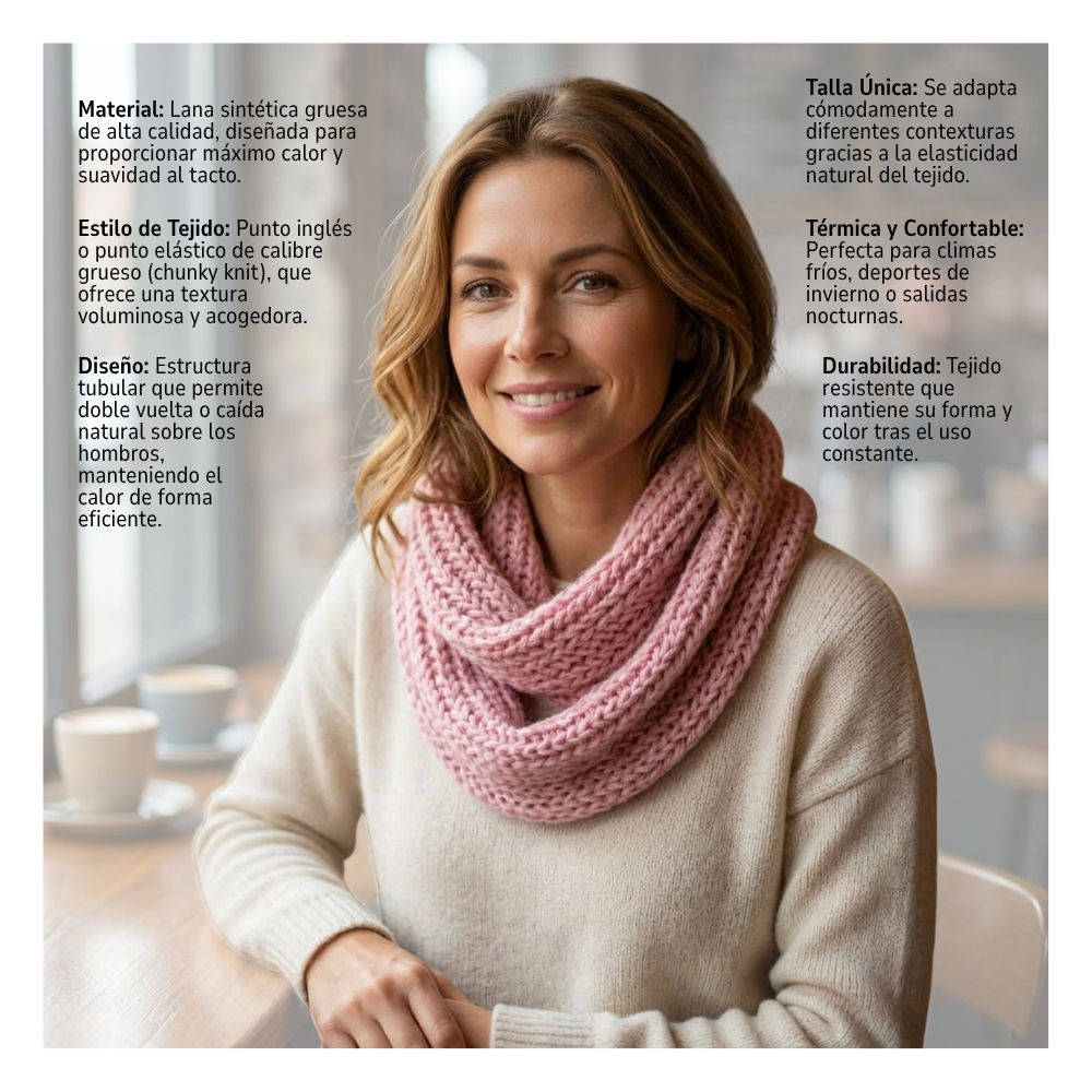Mantente abrigado y cómodo durante los días fríos con esta bufanda tipo cuello confeccionada en tejido estilo punto inglés. Su diseño cerrado permite una colocación rápida y sencilla, entregando protección eficaz contra el frío y el viento, sin necesidad de hacer nudos.