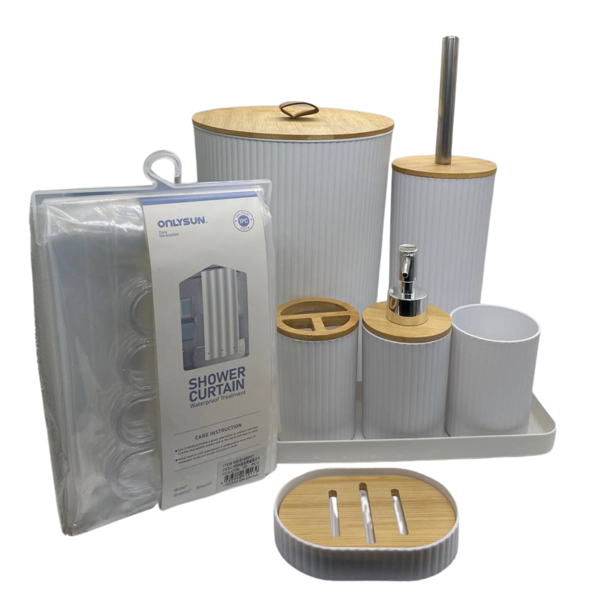 Renueva tu baño con este set completo de accesorios, diseñado para combinar funcionalidad, estilo moderno y materiales de alta calidad. Su acabado en blanco con detalles en bambú natural aporta un toque elegante y minimalista, ideal para cualquier tipo de decoración.