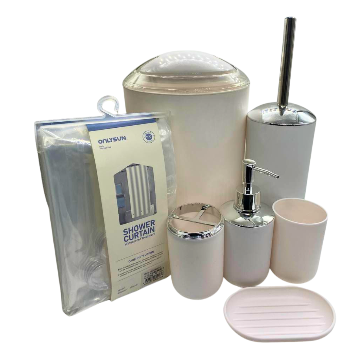 Un set completo que aporta orden, estilo y practicidad a tu baño, con el beneficio adicional de incluir cortina de baño de obsequio.
