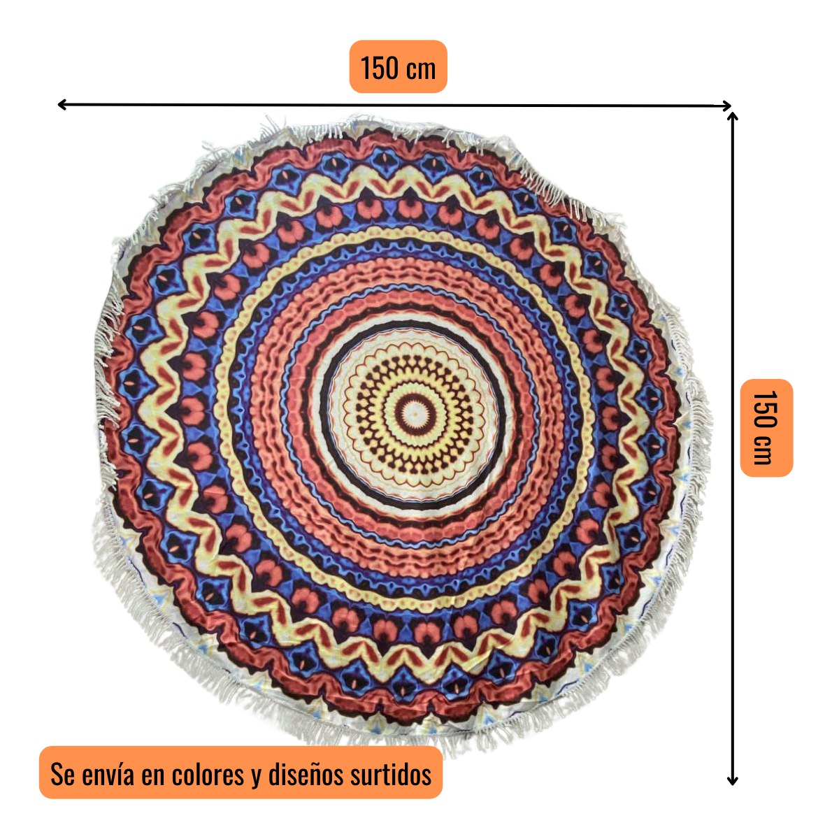 Práctica toalla redonda ideal para uso en playa, piscina y actividades al aire libre. Su tamaño de 150 x 150 cm ofrece amplio espacio para descansar, secarse o usar como manta sobre arena, pasto o superficies planas.