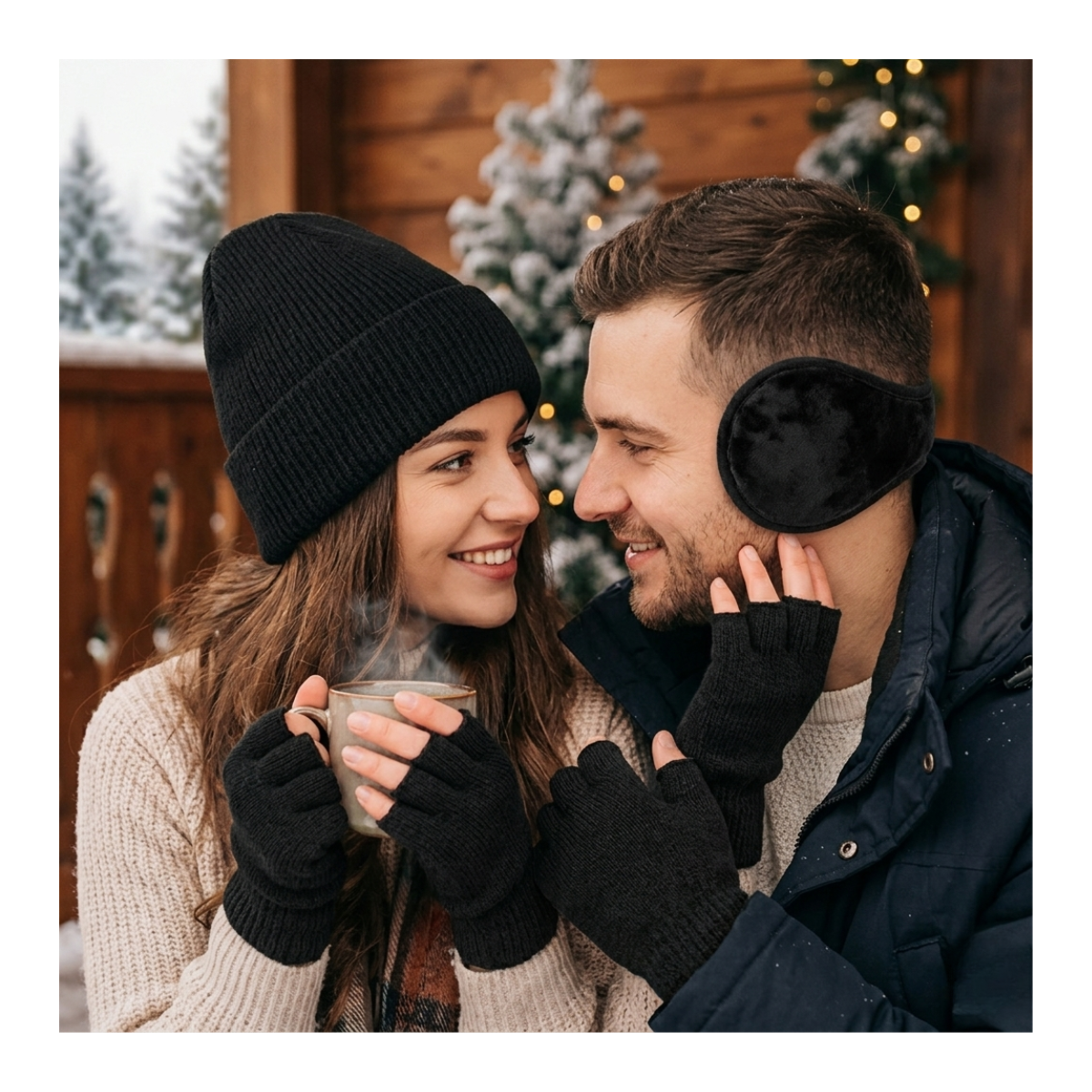 Set Invierno Unisex 3 Piezas Gorro Beanie Polar Guantes Sin Dedos Orejeras Negro